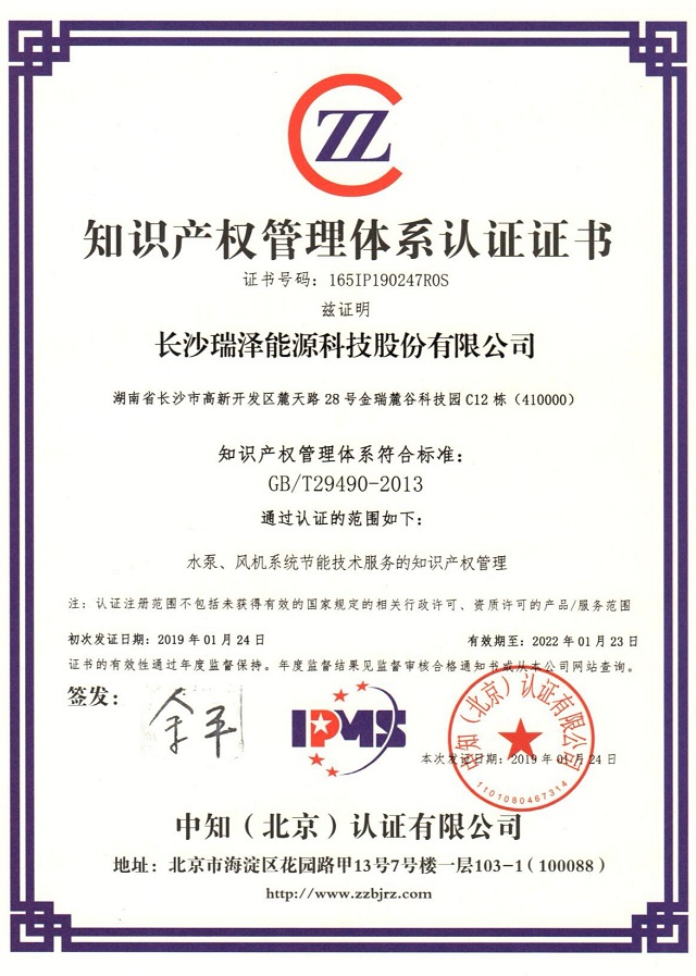 近期,長沙瑞澤能源科技股份有限公司順利通過知識產權管理體系認證,并獲得了中知(北京)認證有限公司提供的知識產權管理體系認證證書。