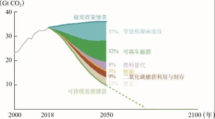 圖1 面向2度目標的能源系統減排二氧化碳主要途徑分析