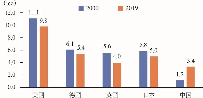 圖2 2000年與2019年中國和典型發達國家人均能源消費量